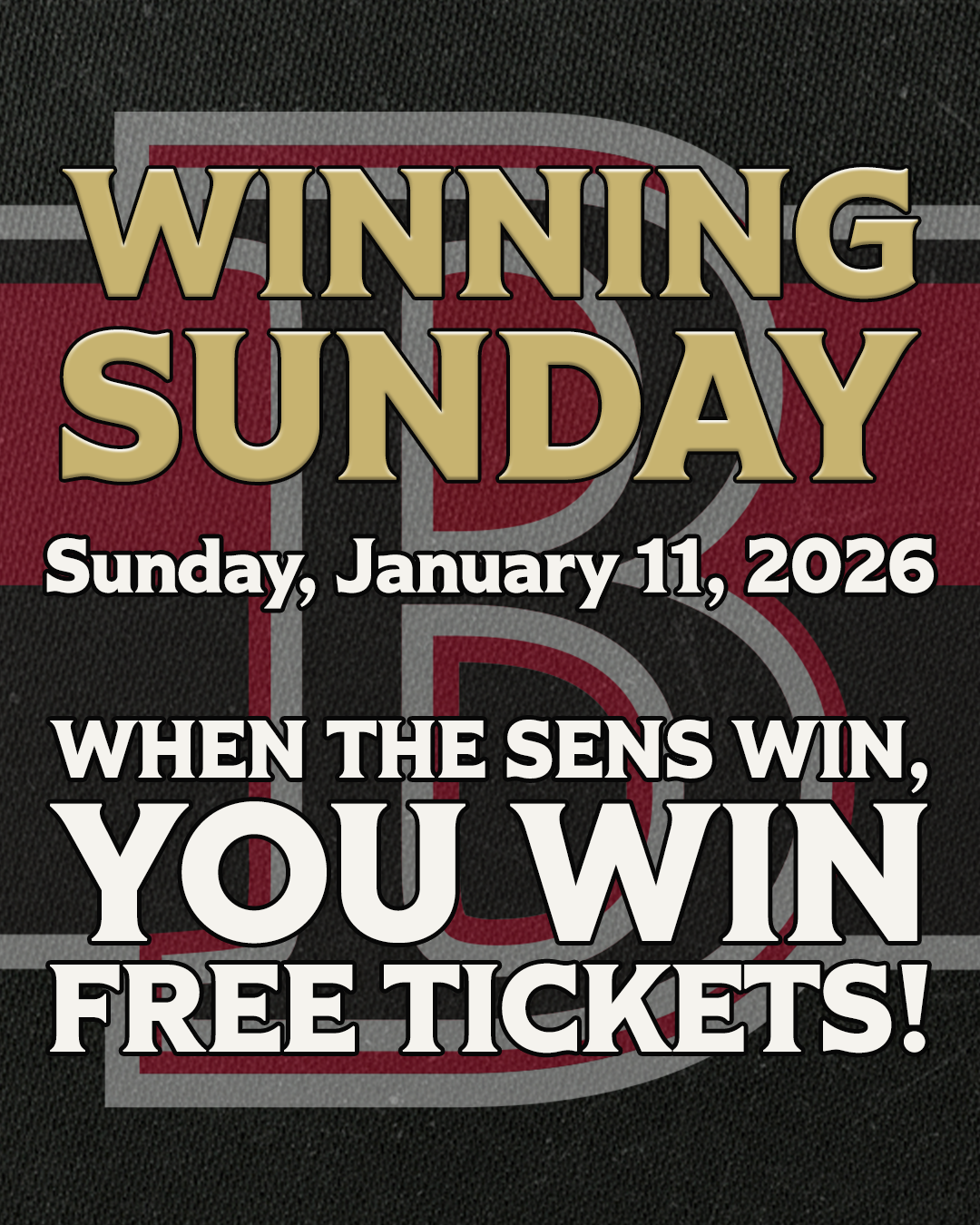 The Senators are turning the game on Sunday, January 11, 2026 against the Rochester Americans (AHL Affiliate of the Buffalo Sabres) into a “Winning Sunday”, meaning if the Senators win, all fans who purchase a ticket and attend that game will receive a free ticket to the game on Wednesday, February 18, 2026, against the Syracuse Crunch (AHL Affiliate of the Tampa Bay Lightning).